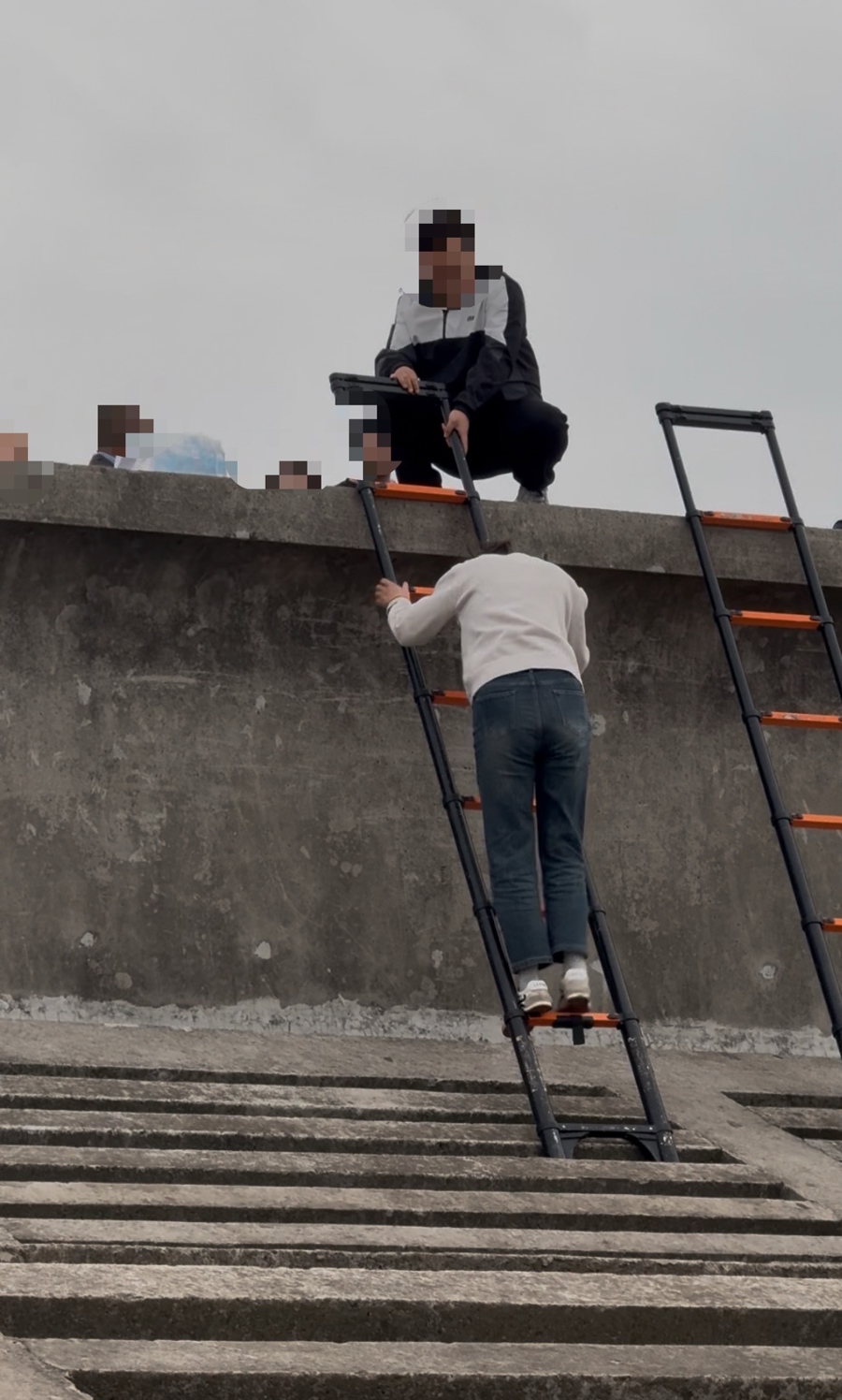 丁坝的正南方,路边有一群人正围在一起,低头看着什么,记者赶忙走上前去。一男子看记者过来,忙问:“下去吗?5元包来回。”说着便指了指面前的二维码,这大概正是帖文中说的“收费梯子”。问及梯子情况时,该男子很坦然:“自己带来的,你也可以自己翻。”为了查看堤坝另一侧的情况,记者缴纳了5元,在该男子的搀扶下踩凳子爬上堤岸,才看到堤岸另一侧也架设了两台梯子,梯子下方紧紧扣在水泥斜坡的空隙处,倒是十分安稳。而要前往取景地的核心,得先爬下梯子,再走下斜坡。而且,堤坝北侧的设计明显和南侧道路存在高度差,翻过堤坝后,高度已然接近两米……