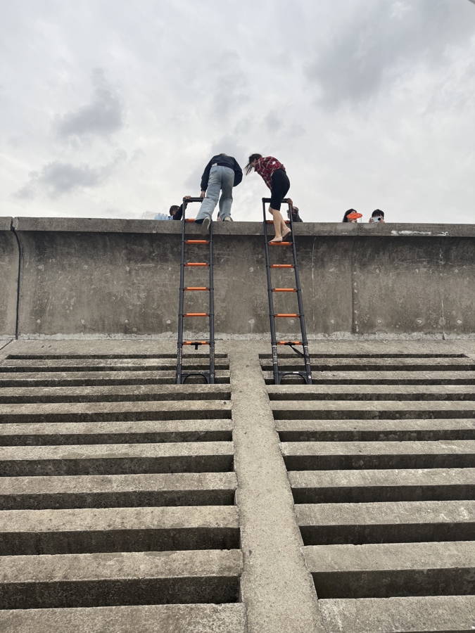在堤坝另一侧,设有两个梯子供游客翻越。