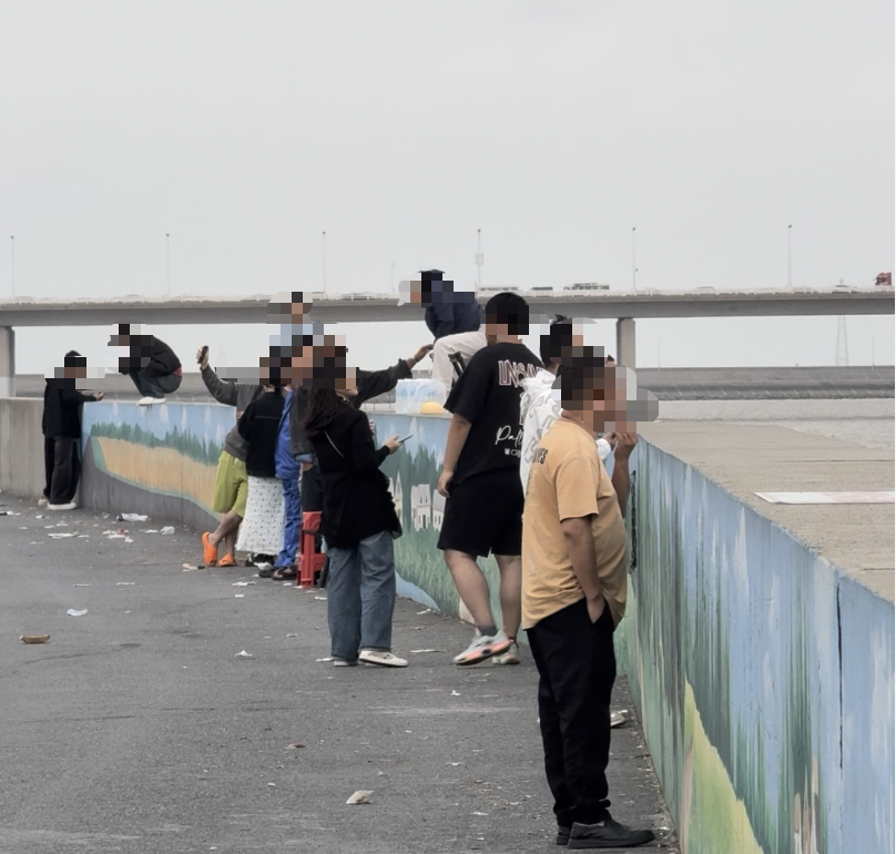 记者步行前往最终的目的地。越往西走,行人和车辆的数量逐渐多了起来,还有不少摊贩在这里售卖小吃、饮料等。道路北侧,游客们在堤坝前驻足观景。面前这道水泥筑的堤坝高约1.3米,宽约50厘米,一些身手敏捷的游客,借力一蹬,便可翻跃过去。但对常人来说难度不小,不少人尝试后选择了放弃。