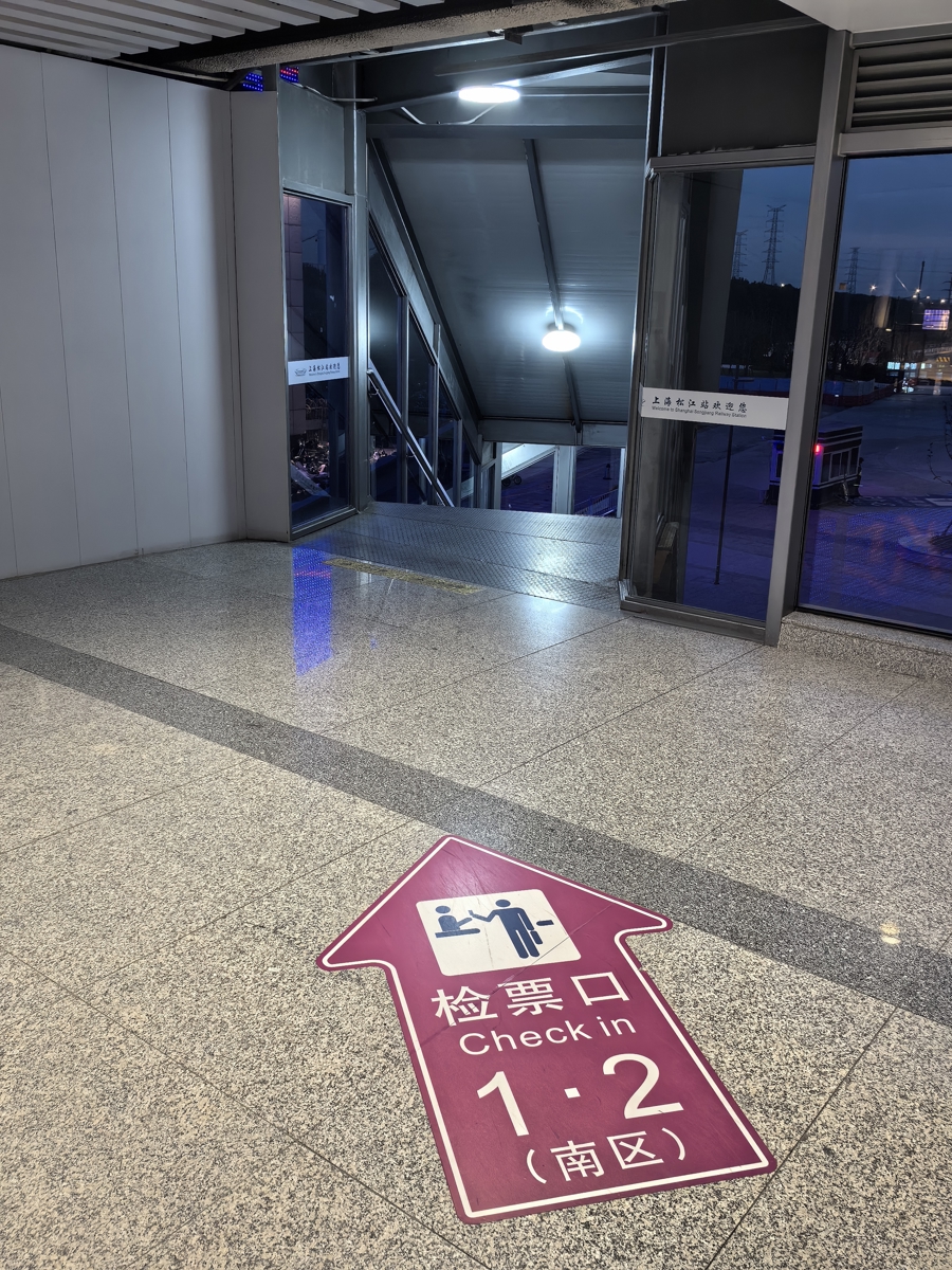 松江站北区候车大厅的中央地面上,贴着巨大显眼的指示标志,指引乘客如何前往南区以及无障碍电梯所处的位置。
