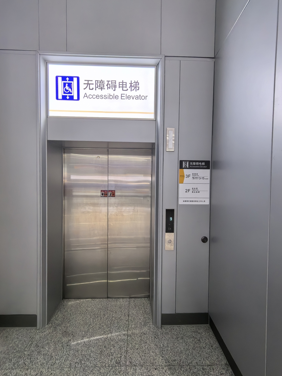 根据无障碍电梯上贴着的指示,记者要乘坐电梯前往2楼站台层,并通过“南北连廊”,前往南区。