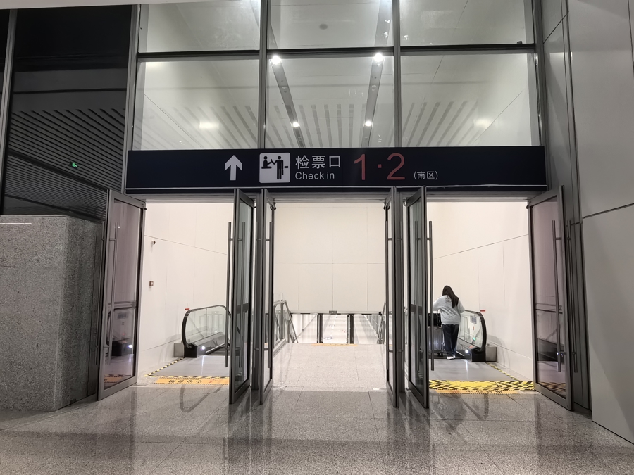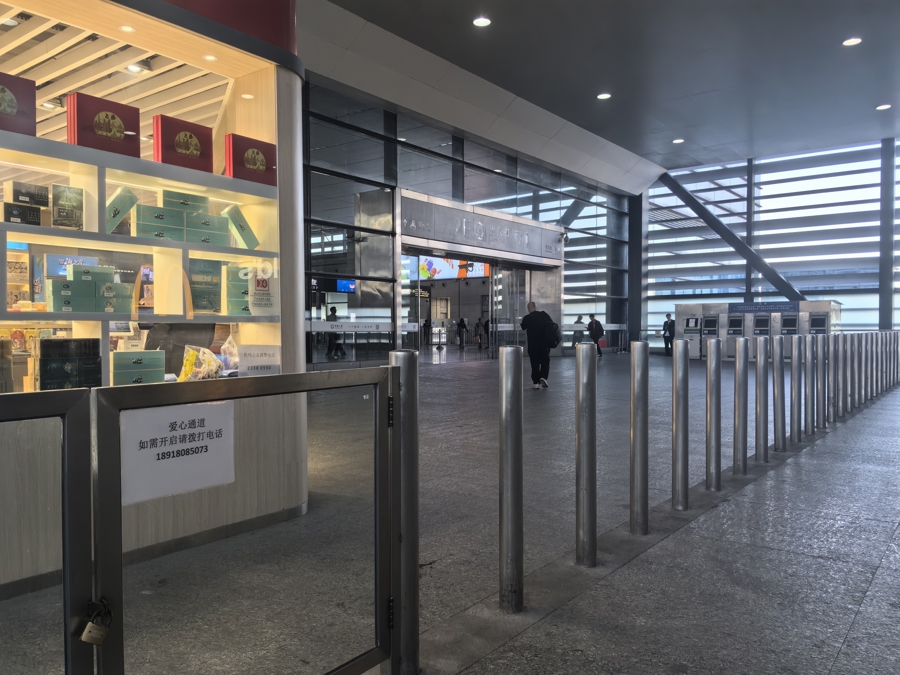 虹桥枢纽在机场与高铁站连接通道的尽头处安装了一排不锈钢路障,一侧留有了可供轮椅通行的一扇门作为“爱心通道”。