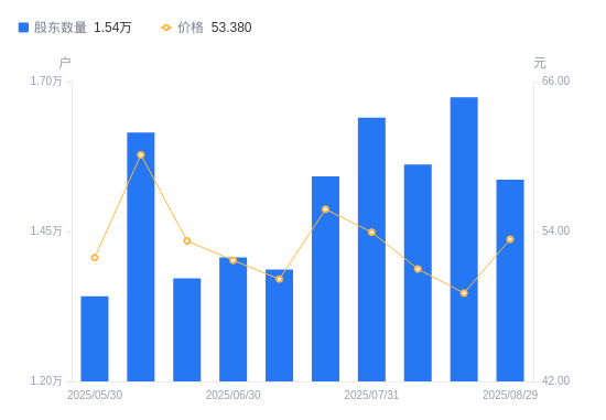9月24日消息,数据显示,截至2025年9月19日,A股股东总户数为1.59万户,较上期(2025年9月10日)增加2420户,增幅18.00%。公司最新A股总股本为14.05亿股,其中流通A股12.47亿股,户均持有流通A股数量为7.86万股,较上期减少1.42万股,降幅15.26%;户均持流通A股市值400.73万元,较上期减少118.81万元,降幅22.87%。